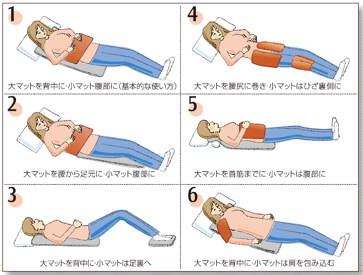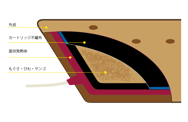 キューマットは、不織布で包装された『もぐさ』『サンゴ』『枇杷』などが組み合わされたカートリッジを、特殊面状発熱体により燻蒸させ、温和な湿った熱を体内の深部まで浸透させます。